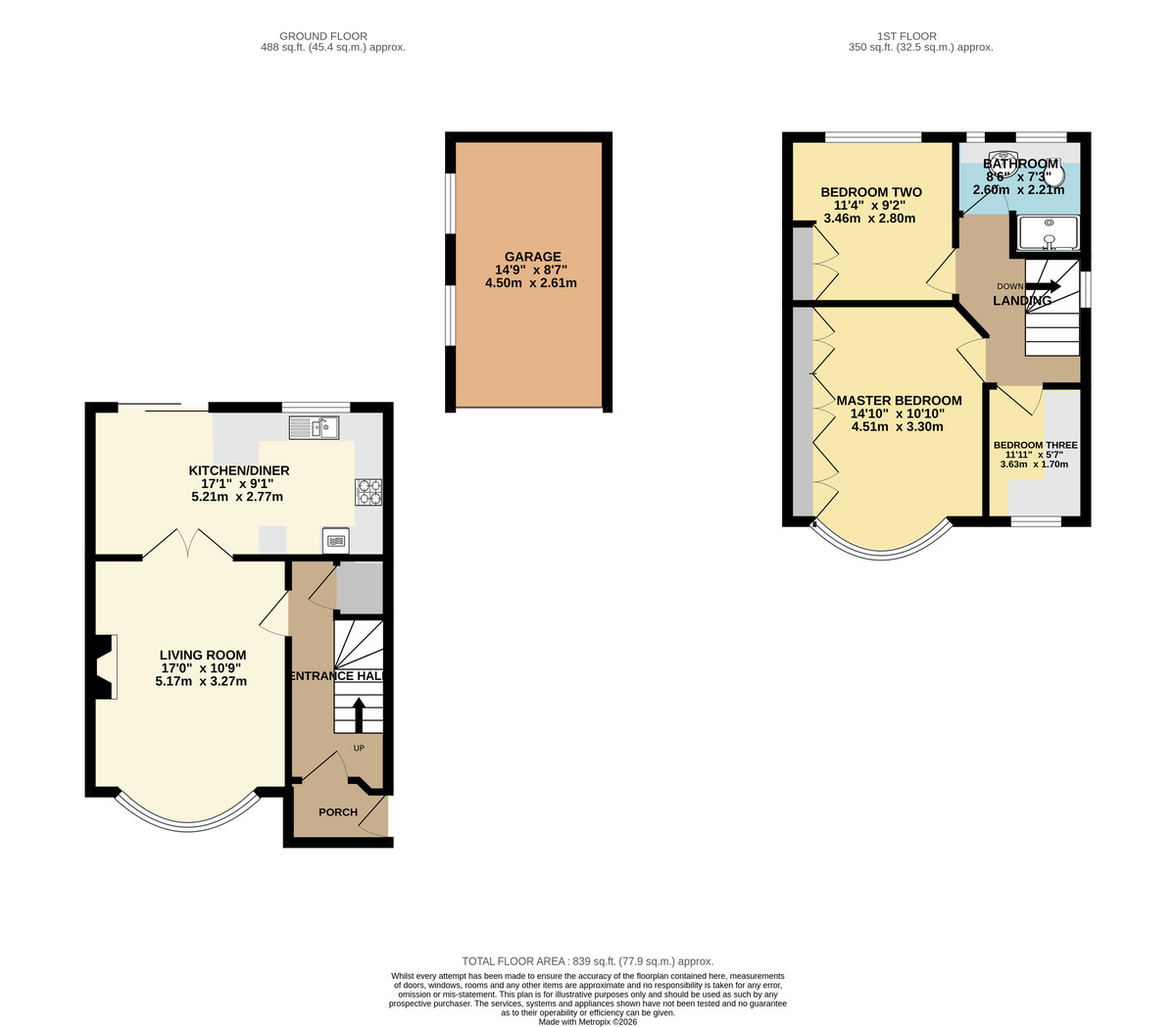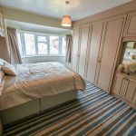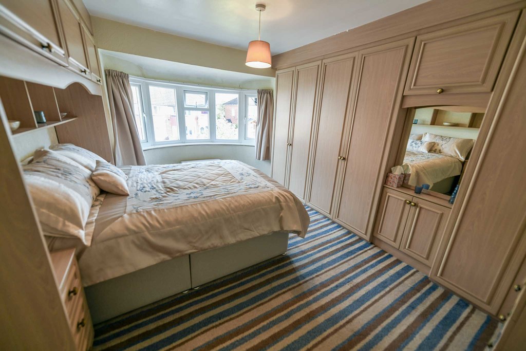 MASTER BEDROOM 14' 9" x 11' 5" (4.51m x 3.50m) The master bedroom, located at the front of the property, benefits from a uPVC double-glazed bay window to the front aspect, which floods the space with natural light. The room features built-in wardrobes, built-in over-bed storage cabinets, carpeted flooring, a pendant light fitting, and a single panel radiator.