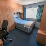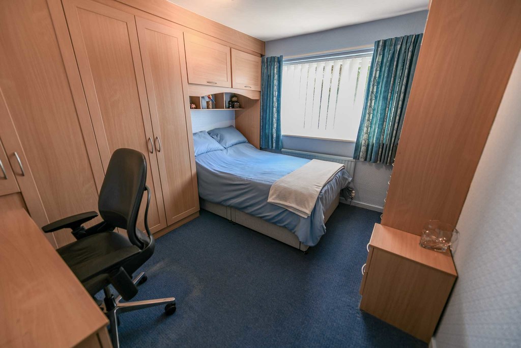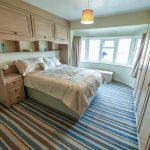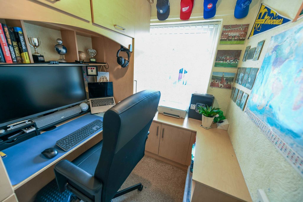 BEDROOM THREE 7' 2" x 5' 6" (2.2m x 1.70m) The third bedroom is a single bedroom, located at the front of the property. The room features a front aspect uPVC double-glazed window, carpeted flooring, a built-in desk and storage cabinets, a single panel radiator, and a pendant light fitting.