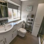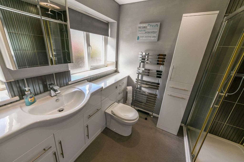 BATHROOM 8' 6" x 7' 3" (2.6m x 2.21m) The modern family bathroom is well-appointed, featuring a stylish vanity unit with an integrated hand wash basin and low-level WC, alongside a spacious shower cubicle fitted with a chrome thermostatic shower system. The room is finished with part-tiled walls, a single panel radiator, and a wall-mounted chrome heated towel rail. Two uPVC double-glazed frosted windows, fitted with roller blinds, provide natural light while maintaining privacy. Additional features include vinyl flooring and recessed spotlighting.