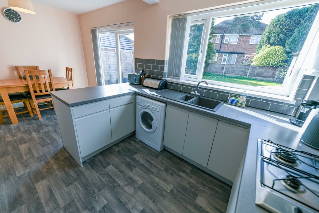 KITCHEN/DINER 17' 1" x 9' 1" (5.21m x 2.77m) The modern kitchen/diner is accessed from the living room and enjoys direct access to the south-facing rear garden via uPVC sliding doors, creating an ideal space for indoor-outdoor living. A large uPVC double-glazed window to the rear further enhances the room, flooding it with natural light.