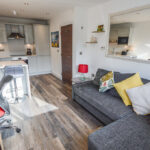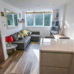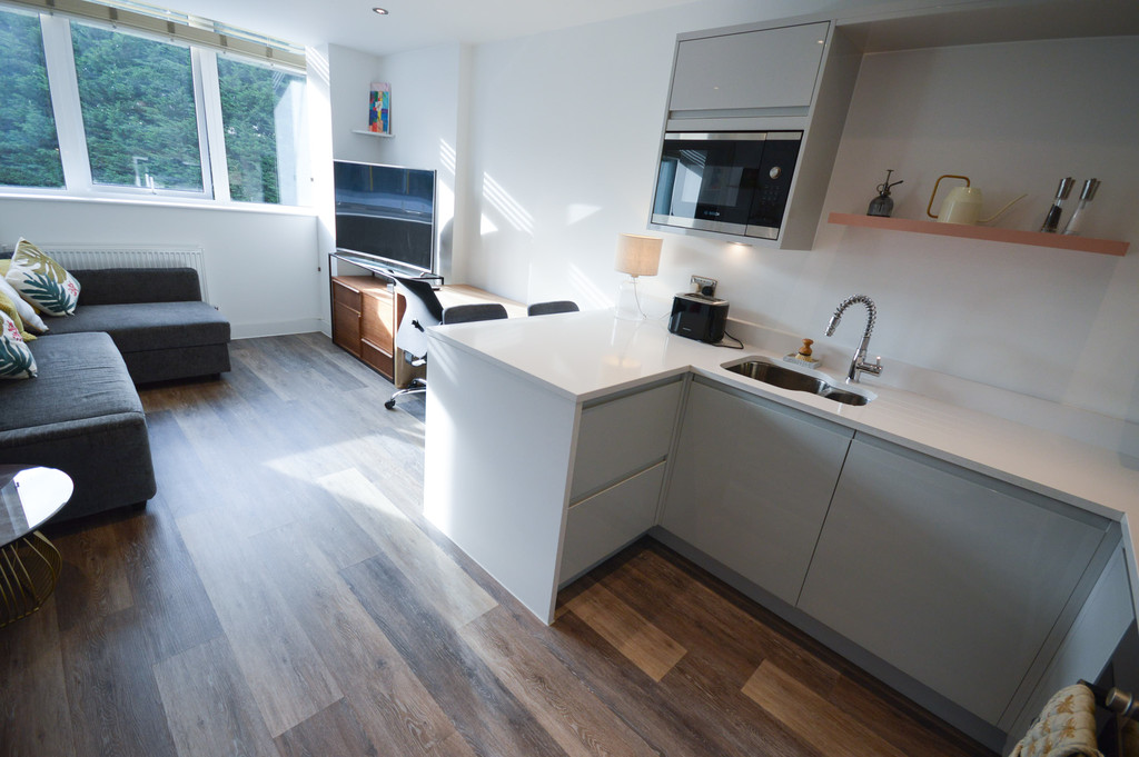 KITCHEN - LOUNGE 9' 8" x 19' 6" (2.95m x 5.95m) The open-plan lounge and kitchen-breakfast room is a bright and welcoming entertaining space. The space is fitted with recessed spotlighting; laminate wood effect flooring; a television point; internet and telephone point; a single panel radiator; and large double glazed windows spanning the length of the rear wall.