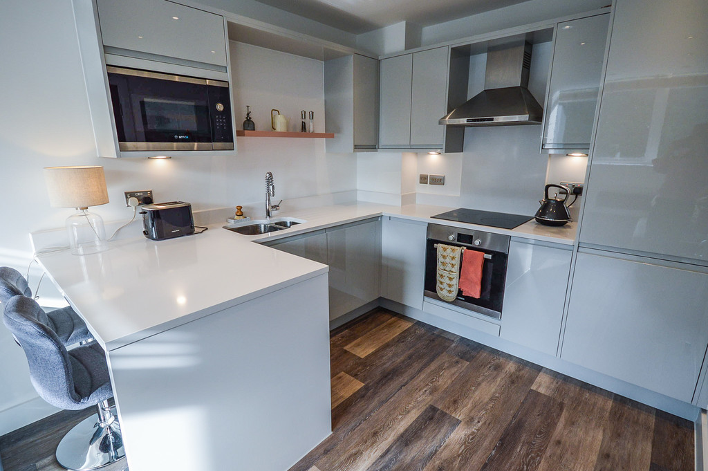 The kitchen is fitted with a range of matching grey high gloss base and eye level storage units with quartz worktops over; a recessed one and a half bowl stainless steel sink; integrated full height fridge-freezer; integrated Bosch microwave oven; integrated full sized dishwasher; Bosch induction hob and oven under, and stainless steel extractor hood over. Adjacent to the kitchen the worktop extends to allow for a breakfast bar.