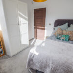 From the bathroom one can access the utility cupboard via double doors. This cupboard houses the immersion heater, electric and water meters, a pendant light fitting and space and plumbing for a washing machine.