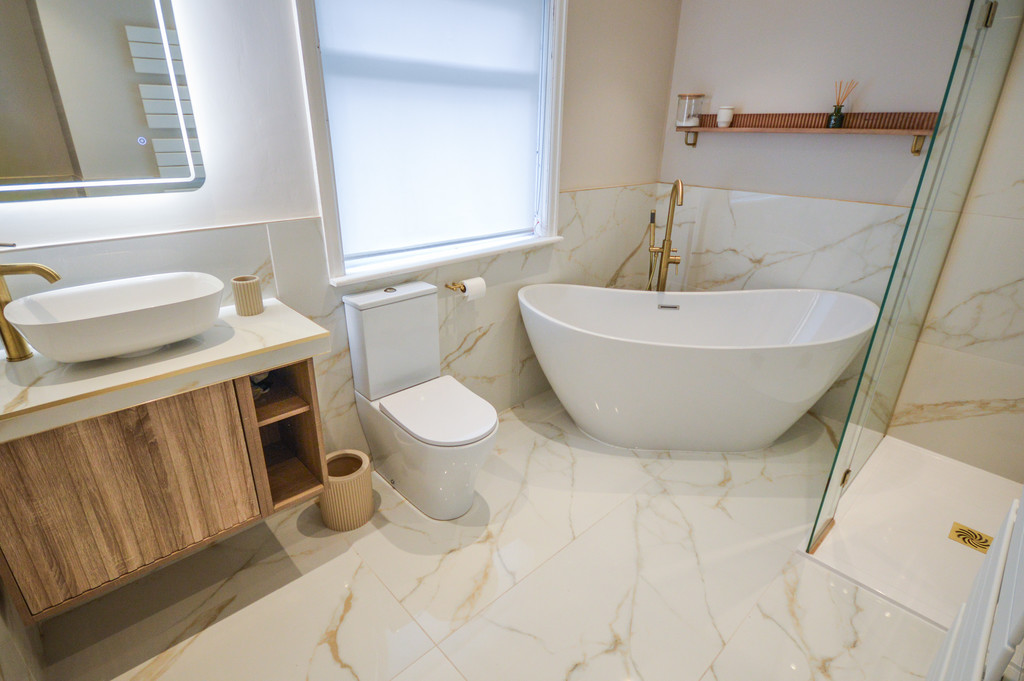 EN SUITE BATHROOM 10' 5" x 7' 4" (3.18m x 2.26m) The en suite bathroom is beautifully appointed with a large freestanding bathtub; a walk in shower cubicle with thermostatic shower system; a low-level WC; and a countertop hand wash basin with storage under and wall-mounted backlit mirror over. The bathroom offers a uPVC double-glazed window to the side aspect with a voile roller blind; recessed spotlighting; an extractor fan; a wall-mounted heated towel rail; tiled flooring and part-tiled walls.