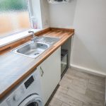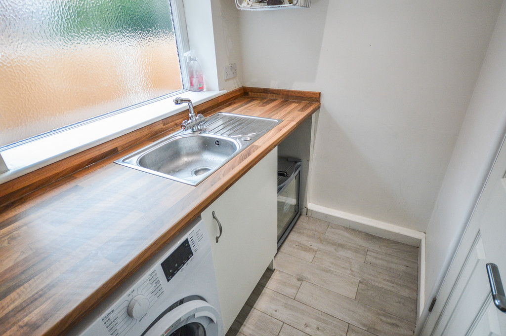 UTILITY ROOM 4' 10" x 6' 6" (1.49m x 2.00m) Located off the kitchen and offering access to the convenient ground floor WC beyond, the utility room is fitted with tiled flooring; recessed spot lighting; a frosted glass uPVC double-glazed window to the side aspect; a wood effect laminate worktop with recessed stainless steel sink; space and plumbing for a washing machine and tumble dryer.