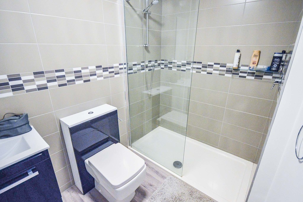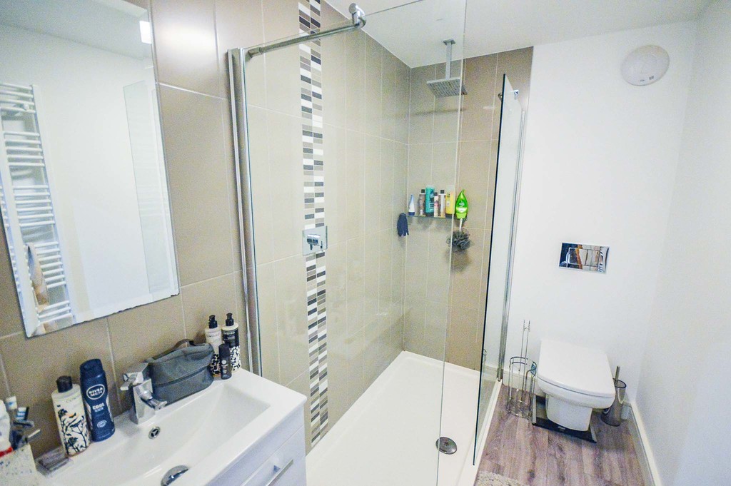 ENSUITE SHOWER ROOM 2 5' 2" x 8' 5" (1.59m x 2.59m) Accessed via the second bedroom is another en suite shower room. This room offers laminate wood effect flooring; part tiled walls; wall mounted hand wash basin with storage under and mirror over; low-level WC; wall mounted heated towel rail, ceiling mounted light fitting; extractor fan and a walk in shower cubicle with glazed screen and chrome thermostatic shower system.