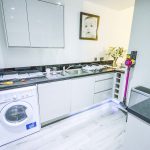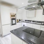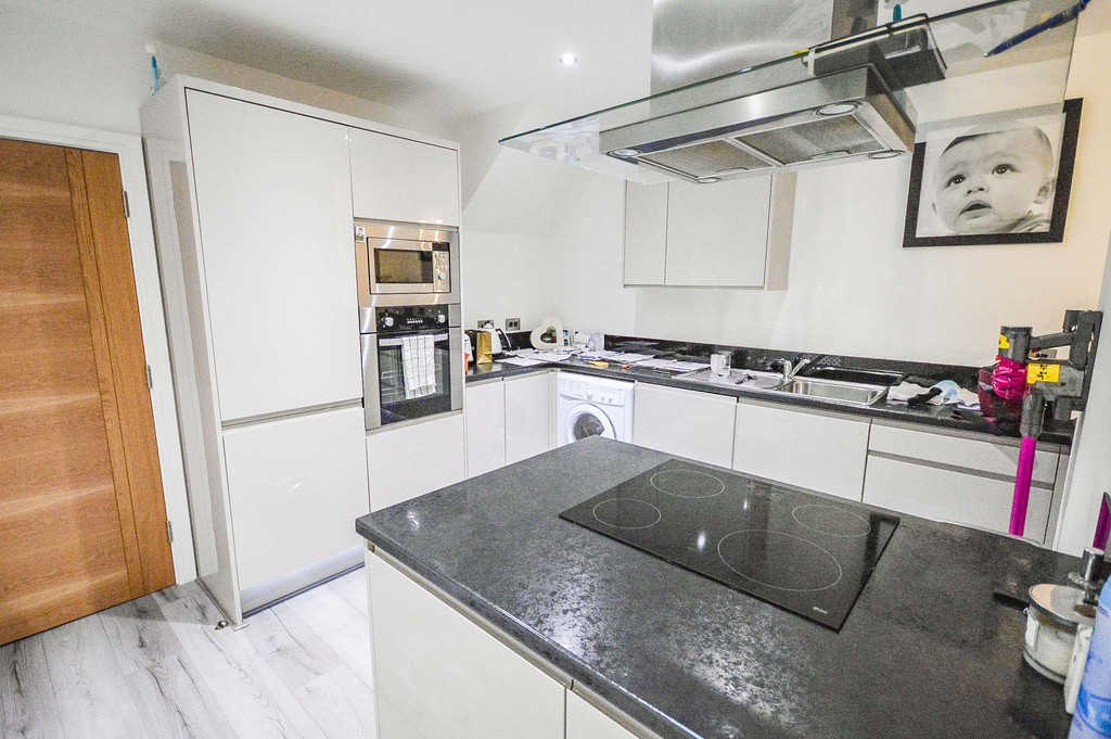 KITCHEN 12' 0" x 10' 1" (3.67m x 3.08m) The kitchen is open to the lounge-diner with continued wood effect laminate flooring and recessed spot lighting. This stylish and modern kitchen is fitted with a range of base and eye level high gloss units. Within the kitchen you will find a recessed stainless steel sink unit with side drainer and chrome mixer tap over; a free standing Indesit washing machine; an integral fridge and freezer; integral oven and microwave; an induction hob with stainless steel extractor over and a wall mounted electric heater behind decorative radiator cover.