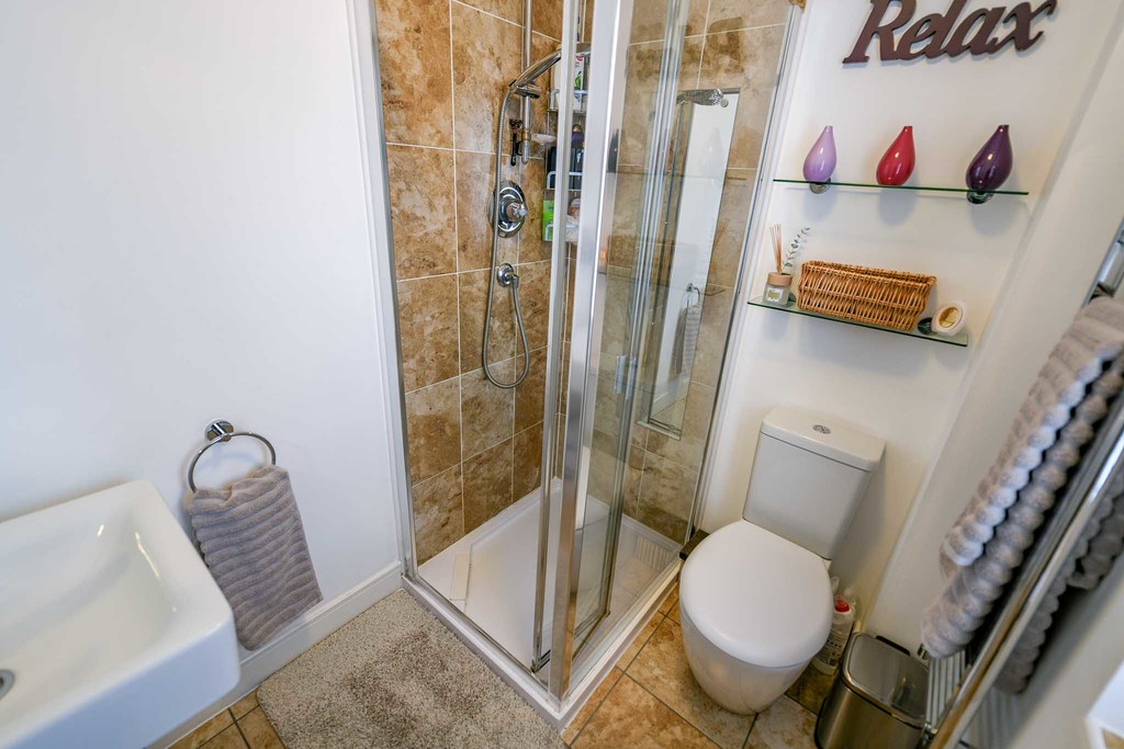 EN SUITE SHOWER ROOM 5' 11" x 5' 1" (1.81m x 1.57m) The en suite shower room is located off the master bedroom with frosted glass double-glazed window to the front aspect, fitted with plantation shutter. This room offers a glazed shower cubicle with chrome thermostatic shower system; tiled flooring and part tiles walls; a wall-mounted hand wash basin; a low-level WC; a shaving socket; extractor fan and a wall-mounted chrome heated towel rail.