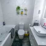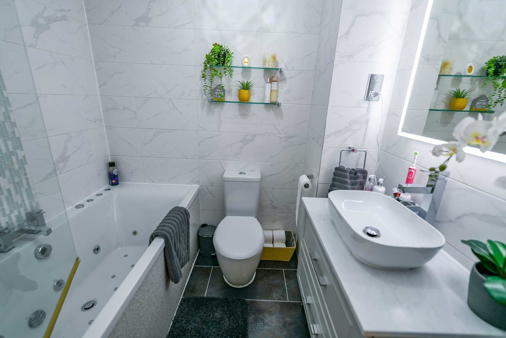 FAMILY BATHROOM 5' 4" x 6' 9" (1.65m x 2.06m) The family bathroom is located on the second floor and has been newly fitted in recently. This bathroom offers a panelled jacuzzi bath, with glazed screen and chrome thermostatic shower system over; a low-level WC; a vanity unit with counter top sink, under sink storage drawers and over sink mirror with integrated Bluetooth speakers and backlit lighting; a shaver socket; extractor fan; LVT tile effect flooring; fully tiled walls; and a wall-mounted chrome heated towel rail.