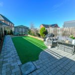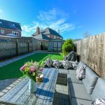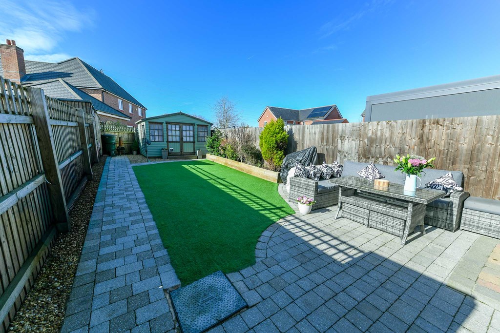 The rear garden is enclosed on three sides by timber panelled fencing. The garden offers a paved seating area and path leading down the garden to the summer house. The garden is laid with an artificial lawn and a raised planting area. The summer house is equipped with lighting, power, an air conditioning unit for heating and cooling, and a television point.