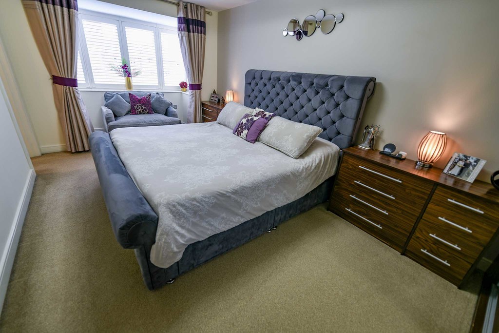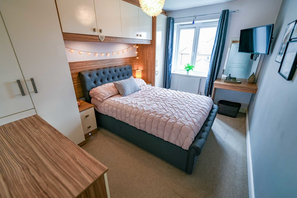 BEDROOM THREE 12' 6" x 8' 7" (3.82m x 2.64m) The third double bedroom is located on the second floor with double-glazed windows to the rear aspect. This room benefits from a range of fitted wardrobes, desk, bedside tables and overbed storage cupboards; a pendant light fitting; television point; carpeted flooring and a single panel radiator.