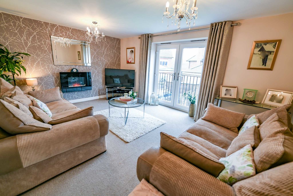 FAMILY ROOM 16' 2" x 12' 4" (4.93m x 3.78m) The family lounge is located on the first-floor with uPVC double-glazed French doors leading to a Juliette balcony. This room offers an electric wall-mounted fire; two single-panel radiators; carpeted flooring; television and telephone points and two pendant light fittings.